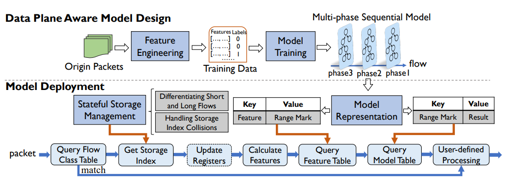NetBeacon is an intelligent data plane system that integrates machine learning models directly into the network data plane for real-time traffic analysis. It introduces a multi-phase sequential architecture to dynamically analyze packets across different flow stages, leveraging flow-level features computable at line speed to significantly improve accuracy. To ensure efficient deployment, NetBeacon designs compact model representations to mitigate table entry explosion and introduces tightly coupled mechanisms to manage stateful storage for concurrent flows. Extensive evaluations demonstrate that NetBeacon advances both accuracy and scalability for a wide range of traffic analysis tasks.