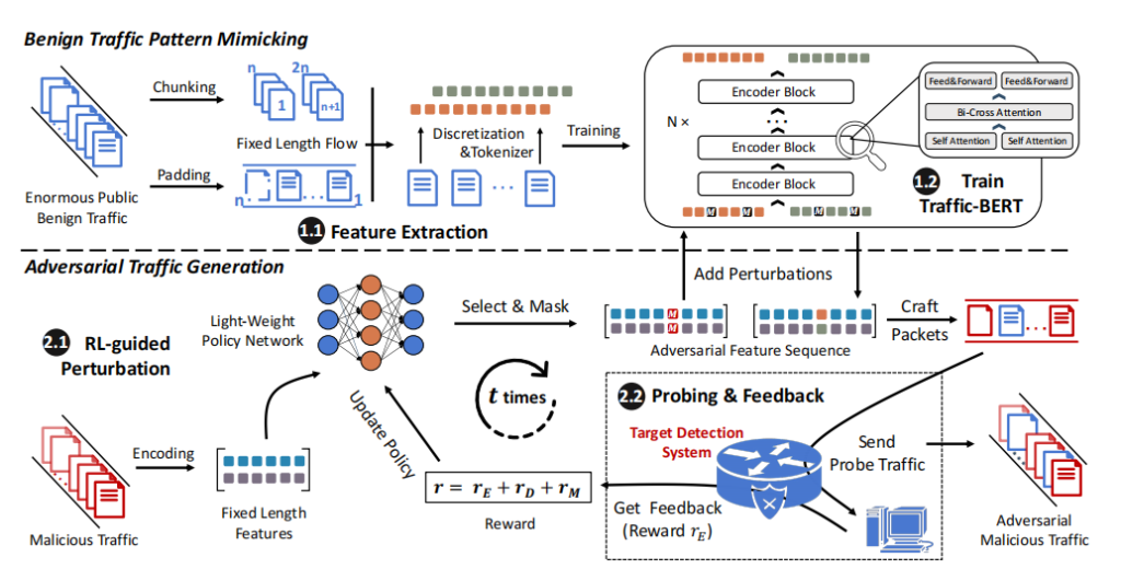 NetMasquerade is a hard-label black-box adversarial attack designed to evaluate the robustness of ML-based malicious traffic detection systems. It is built upon a two-stage framework that first captures benign traffic patterns and then uses them to guide the generation of adversarial traffic. The first stage uses a tailored pre-trained model, Traffic-BERT, to learn diverse benign traffic distributions. The second stage then employs an RL framework to embed these benign traffic patterns into malicious flows with minimal modifications. This method ensures the attack’s efficiency and effectiveness, successfully evading detection while preserving the original malicious functionality.