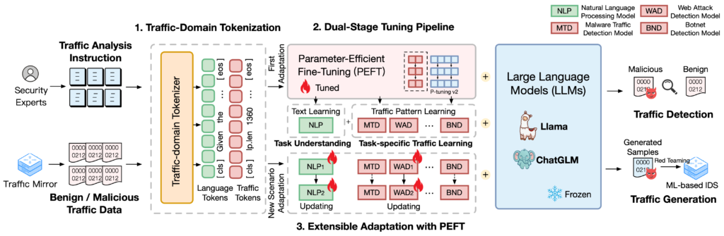 The repository of TrafficLLM is a universal LLM adaptation framework to learn robust traffic representation for all open-sourced LLM in real-world scenarios and enhance the generalization across diverse traffic analysis tasks. TrafficLLM is built upon a sophisticated fine-tuning framework using natural language and traffic data, which proposes the techniques including traffic-domain tokenization, dual-stage tuning pipeline, and extensible adaptation with parameter-effective fine-tuning, to enhance the utility of large language models in network traffic analysis.